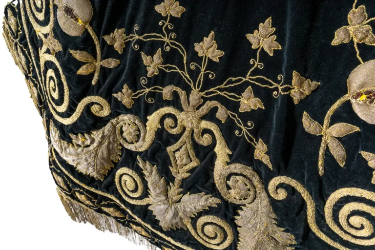 Recientemente se han descubierto en el archivo de la Hermandad unos datos muy interesantes que por primera vez en muchos años arrojan luz sobre el origen de esta obra. El día 28 de marzo de 1824 el sr. Arzobispo de Granada en ese momento, Don Blas Joaquín Álvarez de Palma ( como curiosidad comentar que este arzobispo era jerezano de nacimiento y su retrato esta colocado sobre la puerta que une la Sala Capitular con el presbiterio) le hace entrega al sr. marques de Villareal de un presente para la Santísima Virgen de las Angustias, se trataba de un terciopelo negro para hacer un nuevo manto y se acuerda ese mismo día crear una comisión. El día 12 de julio de ese mismo año se aprueba comenzar el bordado del nuevo manto y aquí viene el dato más importante y curioso, el día 31 de octubre la Hermandad encarga a Don José Marín que haga traer desde la ciudad francesa de Lyon un diseño para el bordado y su costo. Por tanto este dibujo que es expresión del estilo imperante en la época y que después se convirtió en icónico para Granada es al que hoy llamamos: » manto de la Hermandad» y que años después la reina Isabel II tomaría de referencia para mucho más enriquecido de diseño y bordado regalar el suyo. Decimos mucho más enriquecido porque la Hermandad no estuvo exenta de problemas económicos para la realización de este manto, también hemos descubierto que el día 6 de noviembre de 1825 al no haberse recaudado fondos suficientes para la realización del nuevo manto se acordó «celebrar una función de novillos cuyos ingresos se destinaran a tan loable objeto»